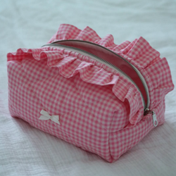 フリルピンクギンガム美しい化粧品バッグパーソナルカスタムロゴ化粧バッグ